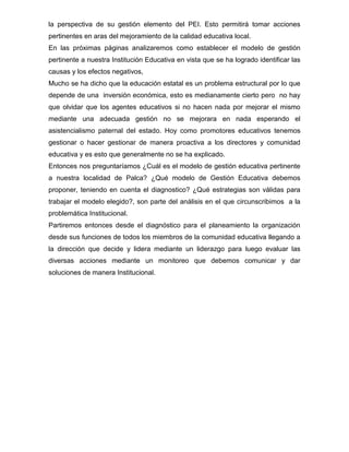 Este documento describe un modelo de gestión educativa para la Institución Educativa "Santo Domingo de Guzmán" en Palca-Tarma. Propone un enfoque de gestión basado en la visión y cultura que se centra en el cambio cultural y líderes visionarios, sustentado en valores y estilo de dirección del equipo. El modelo propuesto se basa en la planeación, organización, dirección y evaluación considerando el plan de acción, hipótesis, ejecución del plan y evaluación reflexiva.