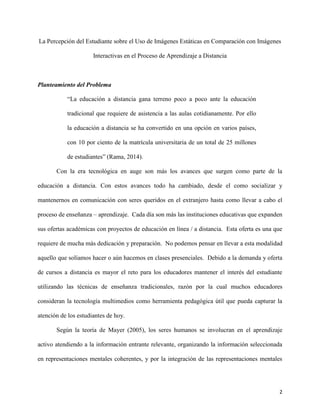 Este documento presenta una propuesta de investigación que examinará si existe una diferencia significativa en el aprendizaje de estudiantes universitarios cuando se utilizan imágenes estáticas versus imágenes interactivas como recursos instructivos en un curso en línea de ingeniería mecánica. La investigación tendrá un enfoque cuantitativo experimental con dos grupos, uno que recibirá instrucción con imágenes estáticas y el otro con imágenes interactivas. Se medirá el aprendizaje de los estudiantes a través de una pre-prueba