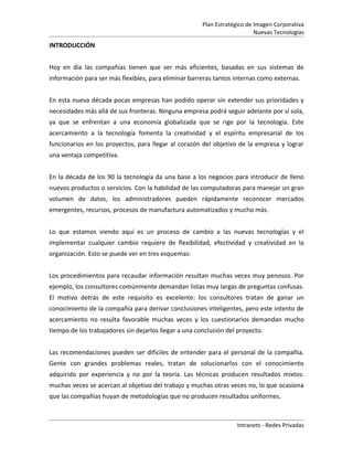 El documento describe la implementación de una intranet corporativa para el Grupo Editorial La Hoguera. Se propone implementar una intranet para proveer acceso a información actualizada de manera rápida y eficiente a los empleados. La intranet permitirá mejorar la eficiencia organizacional y productividad al centralizar la información. Se implementará utilizando estándares como servidores web, clientes y periféricos conectados a través de una red privada.