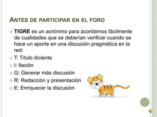 Este documento presenta la propuesta de usar una rúbrica llamada TIGRE para evaluar contribuciones a foros de discusión en línea. TIGRE evalúa 5 categorías: Título, Ilación, Generar discusión, Redacción y Enriquecer discusión. Explica cada categoría y los niveles de desempeño excelente, bueno, regular e inaceptable. También incluye ejemplos de cómo usar la rúbrica de manera asertiva y no asertiva. El objetivo es fomentar discusiones de alta calidad que sean co