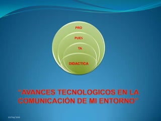Este documento describe una propuesta educativa sobre los avances tecnológicos en la comunicación. El objetivo es que los estudiantes conozcan y utilicen de manera adecuada los diferentes artefactos tecnológicos y medios de comunicación para mejorar las relaciones interpersonales. Se explican conceptos como telemática, tecnología y medios de comunicación, así como su influencia en la comunicación local. La propuesta busca promover el uso responsable de la tecnología y una actitud de respeto entre los estudiantes.