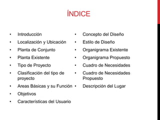 El documento presenta un resumen del Hotel Countryard Marriott. Incluye información sobre la ubicación, plantas existentes, tipos de proyecto, áreas básicas, objetivos y características de los usuarios. También incluye un índice de los temas que se abordarán como concepto de diseño, estilo, organigramas y cuadros de necesidades.
