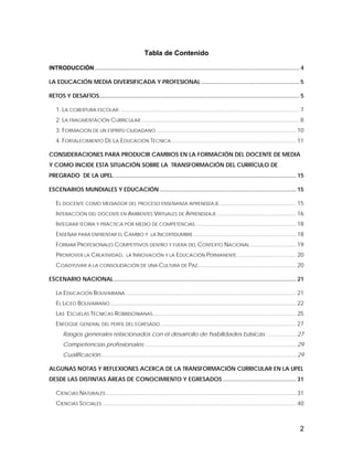 Este documento discute la necesidad de transformar la formación del docente de educación media, diversificada y profesional en Venezuela para enfrentar cuatro desafíos: 1) Aumentar la cobertura escolar y reducir la deserción, 2) Superar la fragmentación curricular, 3) Formar un espíritu ciudadano en los estudiantes, y 4) Fortalecer la educación técnica. Propone que la formación del docente debe prepararlos para atender las características de los adolescentes, integrar la teoría con la práctica a través