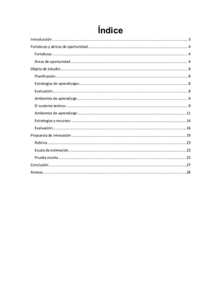 Este documento presenta una propuesta didáctica de innovación para la enseñanza del tema "Cómo son las plantas y los animales del medio acuático y terrestre" en segundo grado. Incluye una introducción, análisis de fortalezas y áreas de oportunidad, objetivo de estudio, estrategias de aprendizaje, evaluación, ambiente de aprendizaje, sustento teórico y propuesta de innovación. El autor propone utilizar más recursos de evaluación, material didáctico atractivo, y promover la participación,