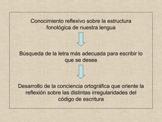 El documento presenta estrategias para el desarrollo de la escritura inicial, incluyendo el desarrollo de la conciencia fonológica y ortográfica a través de ejercicios de reconocimiento y manipulación de sonidos. También describe cuatro momentos en la adquisición de la escritura y diferentes tipos de información ortográfica que pueden ayudar a los estudiantes a subsanar errores.