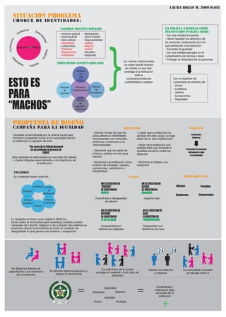 El documento describe una situación de choque entre los valores institucionales de la Policía Nacional y los valores personales de William. Propone una campaña liderada por la Policía para promover la igualdad social y hacer de la institución un ejemplo de inclusión, tolerancia y respeto por los derechos de todas las personas. La campaña incluiría talleres para los miembros de la Policía con el fin de sensibilizarlos y capacitarlos, seguido de una campaña dirigida a toda la comunidad para transmitir un mensaje de que ser parte de la Policía es un privile