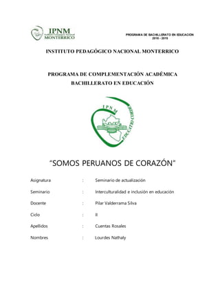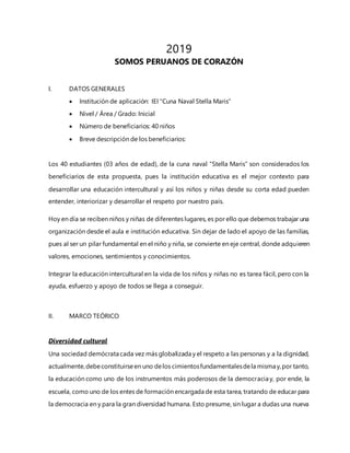 El documento describe una propuesta educativa para promover la interculturalidad en una escuela inicial en el Perú. Presenta el marco teórico sobre diversidad cultural e interculturalidad en el contexto peruano. Explica que la interculturalidad implica respetar las diferencias culturales y construir puentes entre ellas. La propuesta tiene el objetivo de que los estudiantes se identifiquen como peruanos valorando su historia y cultura a través de la danza.
