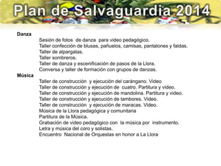 El documento describe una serie de talleres y actividades relacionadas con la manifestación cultural de La Llora en el estado Aragua, Venezuela. Los talleres incluyen danza, música, historia, producción literaria, teatro, artesanía, educación e investigación. También se proponen proyectos como un complejo cultural dedicado a La Llora, un teatro móvil y una ruta turística para promover esta manifestación cultural.