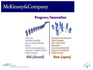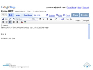 El documento describe los cambios en la sociedad y la educación debido al impacto de las redes e Internet. La información se duplica cada pocos años y aprender ya no significa memorizar datos sino saber buscar información de manera flexible. Las nuevas generaciones han crecido con la tecnología y prefieren aprender de forma interactiva y en red. La identidad digital es tan importante como la real. Internet es una plataforma donde las personas comparten conocimiento de forma colaborativa. Los empleados deben estar incorporados a flujos de información y saber valorar la información relevante en