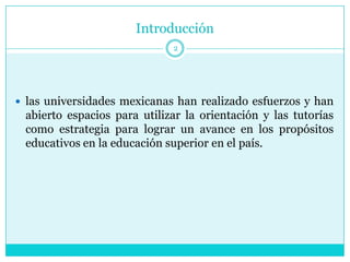 Este documento presenta una propuesta para crear un espacio virtual para mejorar el programa de tutorías en una universidad pública en México. La propuesta sugiere (1) desarrollar un sitio web interactivo con información actualizada sobre el proceso de tutorías para estudiantes y académicos, (2) el sitio proporcionará herramientas y apoyo para la formación académica, y (3) la intención es que sirva como marco de referencia para enriquecer este proceso educativo a través de la tecnología.