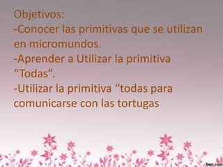 Este documento explica cómo usar la primitiva "todas" en micromundos para comunicarse con múltiples tortugas. La primitiva "todas" permite dar una instrucción a todas las tortugas al mismo tiempo, similar a llamar a varios hermanos a cenar juntos. El documento proporciona un ejemplo de usar "todas [ad 20 espera 1]" para hacer que todas las tortugas avancen 20 pasos y esperen 1 segundo.