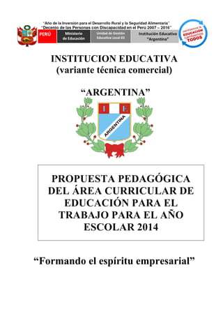 Este documento presenta la propuesta pedagógica del área curricular de Educación para el Trabajo para el año escolar 2014 de la Institución Educativa "Argentina". Describe la organización del área, los proyectos y módulos por grado y especialidad ocupacional. El enfoque del área es desarrollar competencias laborales en los estudiantes para que puedan insertarse en el mundo laboral. El currículo se organiza en torno a las competencias laborales y se fundamenta en enfoques pedagógicos, psicológicos,