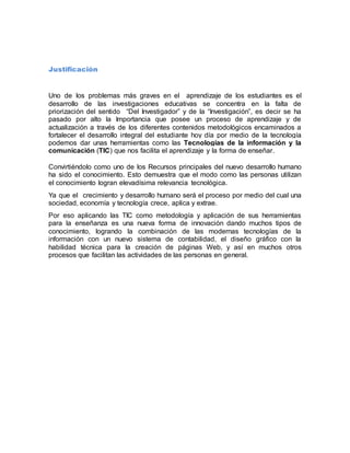 Este documento propone métodos y prácticas adecuadas para el uso de las TIC en los estudiantes con el objetivo de lograr aprendizajes sólidos y la construcción de una nueva sociedad. Describe varias herramientas TIC como GoAnimate, Quizlet y Edmodo que pueden usarse para la enseñanza, la interacción estudiantil y la promoción de los objetivos institucionales. Concluye que el aprendizaje a través de las TIC permite una enseñanza más completa y que su uso debe enfocarse no solo