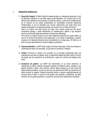 La propuesta busca mejorar el fútbol chileno a través de (1) una ANFP más participativa y abierta que incluya secretarías permanentes y sesiones mensuales, (2) profesionalizar la gestión maximizando la eficiencia del CDF y generando excedentes de la selección, y (3) mejorar la calidad del fútbol con un campeonato atractivo, seguridad en estadios, y apoyo a las divisiones inferiores y exjugadores.