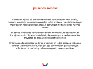Este documento presenta una agencia de marketing digital que ofrece servicios como diseño gráfico, publicidad online, gestión de redes sociales, estrategias de contenido y más. La agencia busca conseguir seguidores, engagement y ventas para sus clientes. También propone diferentes planes de marketing en redes sociales a precios competitivos.