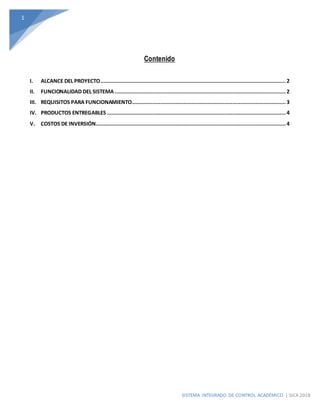 Este documento describe un Sistema Integrado de Control Académico (SICA) que incluye módulos para matrícula, notas, asistencia y pagos. Explica las funcionalidades de cada módulo y los requisitos técnicos para su funcionamiento como un servidor web y base de datos. También detalla los productos entregables como instalación, capacitación y manuales. Por último, indica que el precio del sistema será determinado pero no incluye impuestos.