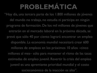 Este documento discute la necesidad de incorporar las TIC en la educación para mejorar las oportunidades de empleo de los jóvenes. Propone el uso de herramientas como Scratch, Hackety Hack y robótica para enseñar programación de una manera lúdica, así como impresión 3D para fomentar la creatividad. También aboga por una nube educativa y mejor conectividad para facilitar el aprendizaje a distancia. Todo ello con el fin de cerrar la brecha entre las habilidades requeridas en el mercado