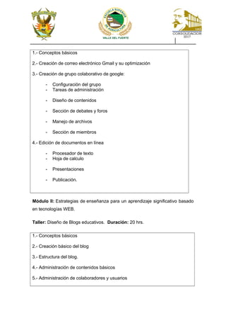 Este documento describe un taller de capacitación de dos módulos para enseñar el uso de recursos en línea de Google como grupos virtuales, blogs y documentos. El primer módulo enseña el diseño de grupos colaborativos a través de Google Groups. El segundo módulo cubre estrategias de enseñanza basadas en la web y se enfoca en el diseño de blogs educativos.