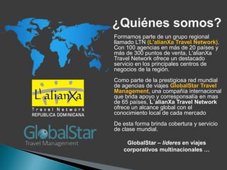 El documento proporciona información sobre Turinter L ́alianxa Travel Netwok, una empresa de consultoría y administración de viajes. Ofrece servicios completos para viajes de negocios y eventos corporativos utilizando herramientas tecnológicas modernas. Forma parte de una red regional de agencias de viajes con cobertura en América Latina y a nivel mundial a través de asociaciones. Su objetivo es satisfacer todas las necesidades de viaje de sus clientes de manera profesional.