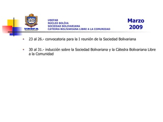 El documento presenta la propuesta de actividades para el semestre I de 2009 de la Sociedad Bolivariana y la Cátedra Bolivariana Libre a la Comunidad de la Universidad Nacional Experimental de las Fuerzas Armadas Bolivarianas. La propuesta incluye talleres, foros, presentaciones, visitas guiadas y ofrendas florales relacionadas con la cultura e historia bolivariana de Venezuela entre los meses de enero y julio de 2009.