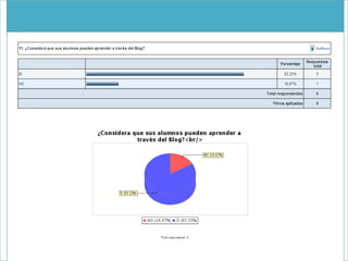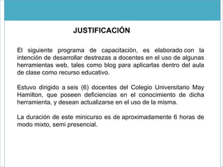 El documento describe un programa de capacitación de 6 horas para 6 docentes sobre el uso de blogs como herramienta educativa. El programa incluye sesiones presenciales y virtuales para enseñar la creación y edición de blogs y entradas. Se aplicó una evaluación diagnóstica inicial y final para medir el aprendizaje de los docentes.