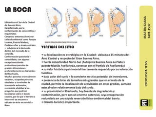 La propuesta presenta un proyecto para desarrollar un Campus Universitario en La Boca que incluya una Facultad de Arquitectura y una residencia de estudiantes. El objetivo es mejorar la educación superior en el barrio a través de la creación de un centro de aprendizaje vinculado al Museo de Arte Construido ubicado en la manzana.