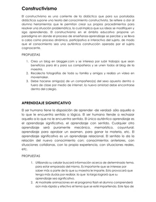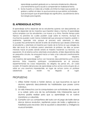 El documento presenta diferentes enfoques pedagógicos como el constructivismo, aprendizaje significativo, aprendizaje activo, aprendizaje colaborativo y aprendizaje basado en problemas. Para cada enfoque, propone actividades prácticas que los estudiantes pueden realizar utilizando la tecnología como celulares, blogs, videos y juegos interactivos para aplicar estos métodos de aprendizaje.