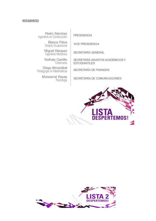 Este documento presenta la lista Despertemos!, una comunidad de estudiantes de la Universidad de Magallanes comprometidos con una educación laica, pluralista y con participación estudiantil. Su objetivo es recuperar la federación de estudiantes y alejarla de manipulaciones externas, dando voz a los estudiantes. Proponen construir una nueva universidad removiendo estructuras desgastadas y acercando la casa de estudios a la comunidad. Finalmente, llaman a despertar la participación colectiva para transformar la universidad.