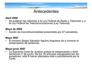 La Ley Federal de Telecomunicaciones y de Contenidos Audiovisuales, promulgada en abril de 2010, establece un marco regulatorio que promueve la competencia, protege los derechos de los usuarios y fomenta la producción nacional en radiodifusión y telecomunicaciones. Esta ley surgió tras reformas y sentencias de la Suprema Corte, buscando homogeneizar concesiones y permisos, así como ampliar la participación de la inversión extranjera. Además, se introducen principios para regular contenidos, protección de derechos y promoción de la diversidad en la programación.