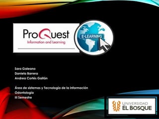 Este documento lista los tipos de documentos que maneja la base de datos ProQuest y los documentos utilizados comúnmente en odontología. Entre los documentos más usados en odontología se encuentran artículos, atención en salud basada en evidencias, bibliografías, documentos de referencia, ensayos, informes, libros, ponencias, reseñas/revisiones, revistas profesionales y tesis doctorales. El documento también proporciona breves definiciones de estos tipos de documentos.