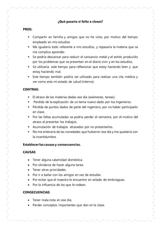 Este documento discute las posibles consecuencias de faltar a clases desde varios puntos de vista. Algunas consecuencias negativas incluyen atrasarse en las materias, perder puntos y conceptos importantes, y posiblemente reprobar el semestre. El documento también considera cómo los padres, hermanos, amigos y profesores podrían ver faltar a clases. Finalmente, ofrece algunas alternativas de solución como organizar mejor el tiempo, establecer las prioridades correctas y no dejarse influenciar por malas amistades.