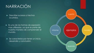 Este documento presenta las principales formas de expresión del lenguaje como la narrativa, descripción, argumentación, definición, instrucción y diálogo. Describe cada forma y ofrece detalles sobre sus características, tipos y elementos clave. La narrativa se utiliza comúnmente para describir sucesos y tiene un inicio, desarrollo y conclusión, mientras que la descripción usa detalles y adjetivos para crear imágenes. La argumentación busca convencer mediante el uso de verbos, sustantivos y adjetivos. La definición
