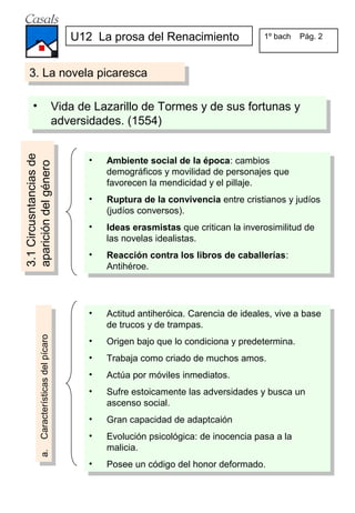 Este documento resume los principales tipos de prosa del Renacimiento español, incluyendo la prosa didáctica, histórica, religiosa y narrativa. Describe las formas narrativas como los libros de caballerías, la novela corta italiana, la novela pastoril, la novela bizantina y la novela morisca. También analiza el origen y características de la novela picaresca, con énfasis en la vida de Lazarillo de Tormes, y cómo evolucionó este género literario.