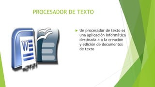 El documento habla sobre procesadores de texto y describe Word y Writer. Explica que un procesador de texto es una aplicación para crear y editar documentos de texto y que Word y Writer son dos de los procesadores de texto más utilizados, siendo Word ideal para elaborar cartas y tareas con texto y Writer una opción gratuita. También incluye una imagen del entorno de Writer resaltando sus barras y cuadro de texto.
