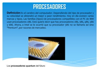 PROCESADORES Definición:Es el cerebrodel computador. Dependiendo del tipo de procesador y su velocidad se obtendrá un mejor o peor rendimiento. Hoy en día existen varias marcas y tipos. Las familias (tipos) de procesadores compatibles con el PC de IBM usan procesadores x86. Esto quiere decir que hay procesadores 286, 386, 486, 586 y 686. Ahora, a Intel se le ocurrió que su procesador 586 no se llamaría así sino "Pentium", por razones de mercadeo. Los procesadores quantum del fúturo
