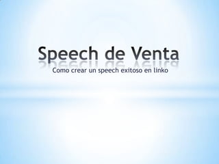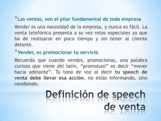 El documento ofrece consejos para crear un speech de ventas exitoso por teléfono. Explica que el speech debe promocionar el servicio moviéndolo hacia adelante en la mente del cliente y despertando su necesidad por el mismo. También destaca la importancia de que el vendedor primero se convenza del servicio y le dé utilidad, y que el speech brinde seguridad argumental al cliente para aumentar las posibilidades de ganar la batalla por su venta.