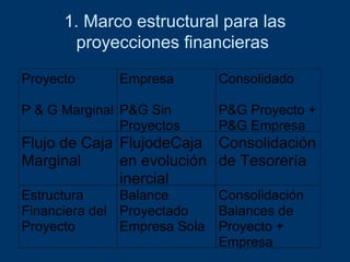 Este documento presenta el marco estructural para realizar proyecciones financieras de una empresa. Explica cómo modelar las proyecciones mediante la definición de variables independientes y dependientes, y cómo proyectar el flujo de caja, balances generales, utilidad y otros indicadores financieros. También describe cómo calcular la estructura financiera del proyecto y la empresa, y cómo evaluar las proyecciones financieras para tomar decisiones de inversión.