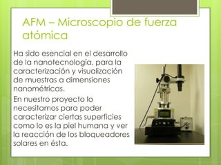 El documento describe tres tecnologías clave para el proyecto: un microscopio de fuerza atómica para caracterizar superficies a nivel nanométrico como la piel humana y ver la reacción de bloqueadores solares; un simulador solar multipuerto que provee luz UV intensa para determinar la protección solar de productos; y un colorímetro para medir con precisión el tipo de piel de las personas de 1 a 6 para las pruebas.