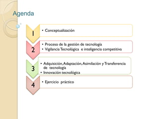 El documento trata sobre la gestión tecnológica. Explica que es una disciplina interdisciplinaria que combina conocimientos de ingeniería, ciencia y administración para planificar, desarrollar e implementar soluciones tecnológicas que ayuden a lograr los objetivos estratégicos de una organización. También describe algunas de las actividades clave de la gestión tecnológica como la vigilancia tecnológica, la adquisición y transferencia de tecnología, e innovación tecnológica.