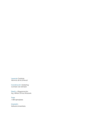 Este documento presenta información sobre la Dirección de Admisión de la Universidad Nacional Hermilio Valdizán, incluyendo las autoridades de la universidad, las 27 carreras profesionales ofrecidas y los requisitos para el proceso de admisión 2017-II. Además, contiene saludos de las máximas autoridades de la universidad y detalles sobre la Dirección de Informática y sus servicios de soporte técnico.