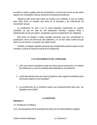 Este documento presenta un proyecto de investigación sobre la prostitución como problema jurídico y social en México. Explica que el tema se centrará en la prostitución en zonas urbanas de México durante el gobierno de Felipe Calderón de 2006 a 2012. Justifica el tema señalando que la prostitución callejera conlleva riesgos para la salud y seguridad. Plantea preguntas sobre cómo el gobierno puede prevenir la prostitución y regularla para mejorar la sociedad. Finalmente, establece objetivos como
