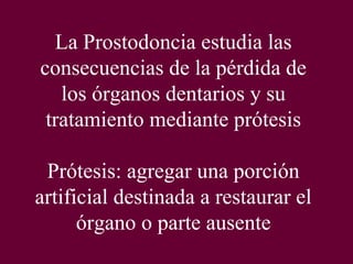 Este documento trata sobre la elección terapéutica protésica en la rehabilitación oclusal. Introduce los conceptos clave de prótesis, prostodoncia, soporte, retención, estabilidad y fijación. También discute los cambios demográficos y epidemiológicos que afectan la práctica de la odontología y la prospectiva de la prostodoncia, incluyendo el aumento de la esperanza de vida y las personas mayores que requieren prótesis.