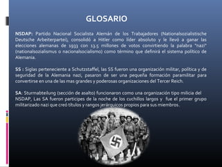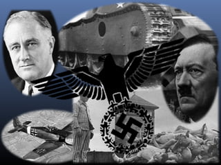 El documento proporciona información sobre los principales líderes y protagonistas de la Segunda Guerra Mundial como Franklin D. Roosevelt, Winston Churchill, Adolf Hitler, Benito Mussolini y Hermann Göring. Describe sus orígenes, carreras políticas y roles durante la guerra. También incluye un glosario que define términos clave como el NSDAP, las SS, el SA, el fascismo y otros.