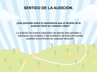 El documento describe la importancia de la audición y los riesgos que representa la exposición al ruido, incluyendo la pérdida auditiva temporal o permanente. Explica que el ruido se define como un sonido indeseado que puede afectar la capacidad auditiva y cómo factores como la frecuencia, intensidad y tiempo de exposición influyen en el riesgo. Finalmente, recomienda el uso de equipos de protección auditiva como orejeras y tapones para minimizar los efectos del ruido en el trabajo.
