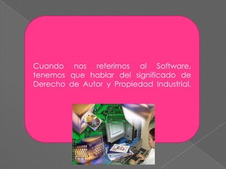 El documento discute si el software debe protegerse bajo derecho de autor o propiedad industrial. Explica que la propiedad intelectual incluye invenciones, obras literarias y artísticas. El derecho de autor protege obras de forma automática al crearse, mientras que la propiedad industrial requiere registro y examen. El autor concluye que el software debe protegerse bajo derecho de autor ya que este se otorga automáticamente sin necesidad de registro.