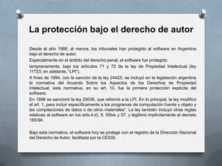 La protección jurídica del software en Argentina y Estados Unidos ha evolucionado a lo largo de los años, pasando inicialmente por la protección de secretos comerciales, hasta llegar al derecho de autor y patentes. En Argentina, el software se protege actualmente mediante el registro en la Dirección Nacional del Derecho de Autor, mientras que en Estados Unidos se ha utilizado una combinación de derechos de autor, patentes y secretos comerciales. Paralelamente surgió el movimiento de software libre como alternativa a las protecciones de propiedad intelectual.
