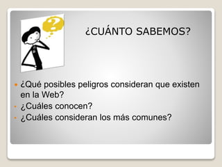 Este documento ofrece información sobre posibles peligros en Internet como ciberacoso, grooming, sexting y delitos informáticos. Explica que el ciberacoso ocurre entre menores, el grooming involucra a adultos que ganan la confianza de menores con fines sexuales, y el sexting envía fotos sexuales de menores. También describe hackeos, suplantación de identidad y phishing como delitos comunes. El documento concluye dando consejos para crear usuarios y contraseñas seguros y comportarse de manera segura online