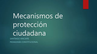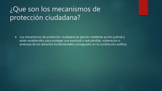 Este documento describe los principales mecanismos de protección ciudadana en Colombia, incluyendo la acción de tutela para proteger derechos fundamentales, las acciones populares para derechos e intereses colectivos, las acciones de clase para grupos afectados por un daño común, la acción de cumplimiento para exigir el cumplimiento de una ley u orden, el hábeas corpus para proteger la libertad personal y el hábeas data para proteger el derecho a la privacidad de datos personales. El autor concluye que estos mecanismos son importantes
