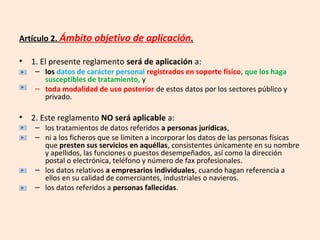 Este documento establece las normas para la protección de datos personales en España. Regula aspectos como el ámbito de aplicación de la ley, los principios de protección de datos, los casos en los que se permite el tratamiento y cesión de datos sin consentimiento, y las verificaciones que pueden realizar las administraciones públicas.