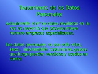 El documento trata sobre la protección de datos personales en Internet. Explica que actualmente hay más datos personales revelados en línea, lo que provoca que haya más empresas que los recopilan y venden sin el consentimiento de los usuarios. También discute la necesidad de leyes internacionales de privacidad debido a las diferencias entre las leyes de privacidad de los países. Resume las normas de privacidad de la Unión Europea y los delitos relacionados con la privacidad como la intrusión ilegal y la intercepción de correos electrónicos. Final